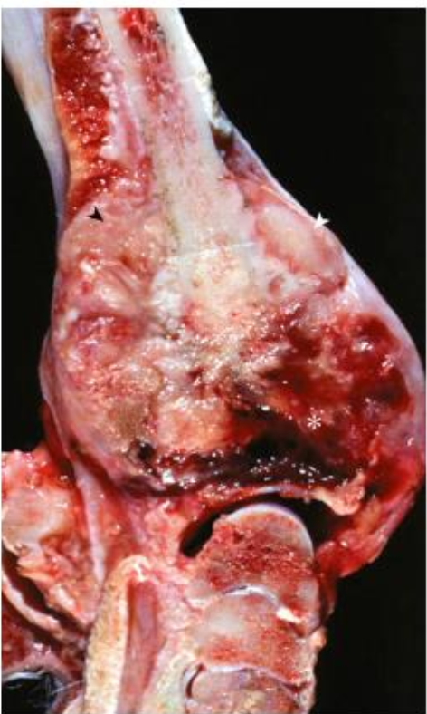 What is affecting this canine distal radius? note the reactive periosteal new bone formation and the large area of hemorrhage and necrosis.