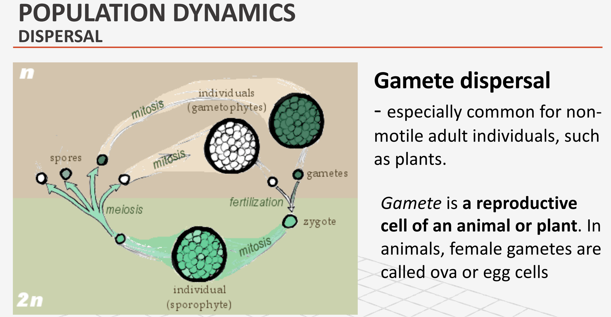 __________ dispersal - especially common for nonmotile adult individuals, such as plants.