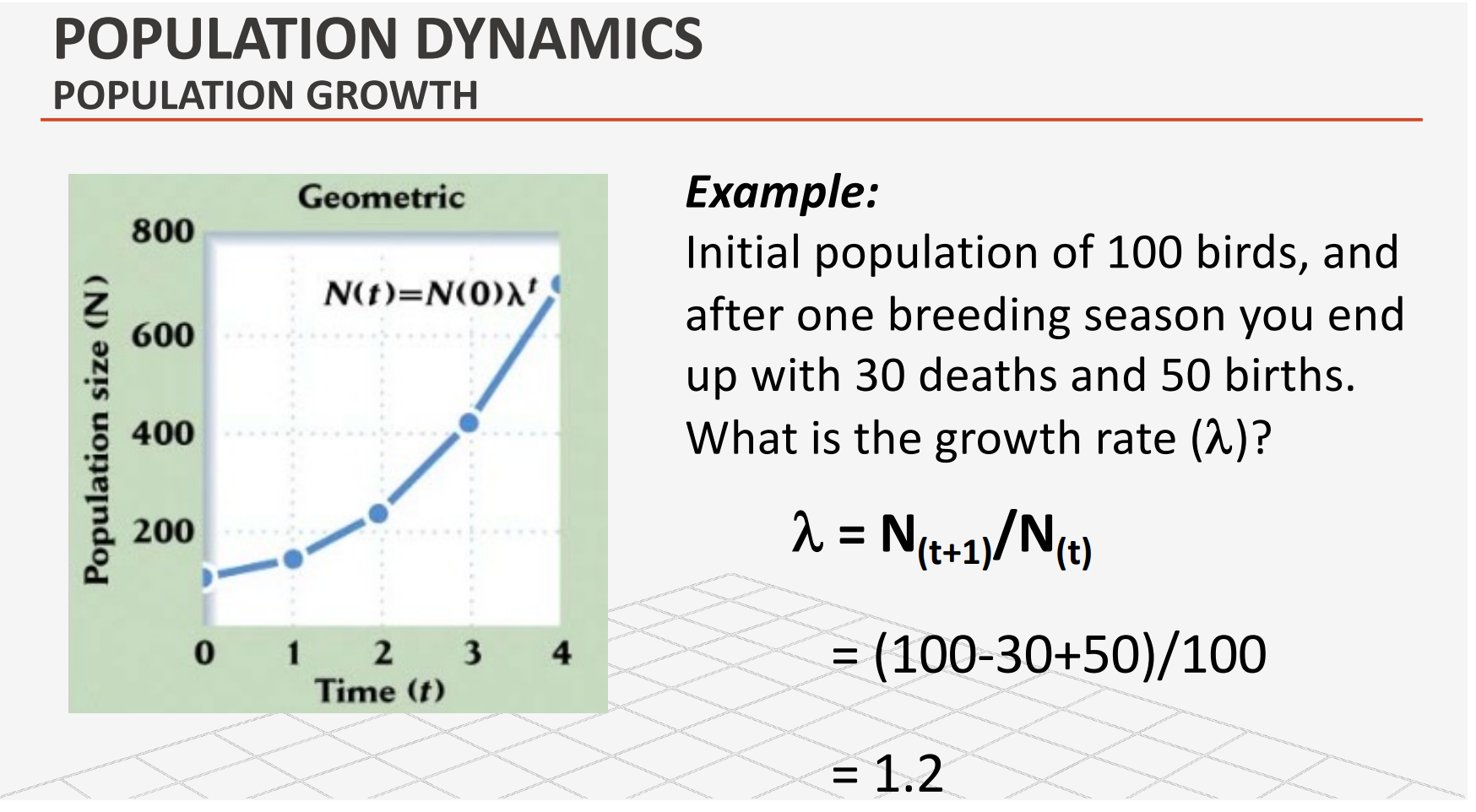 Example: Initial population of 100 birds, and after one breeding season you end up with 30 deaths and 50 births. What is the growth rate (λ)?