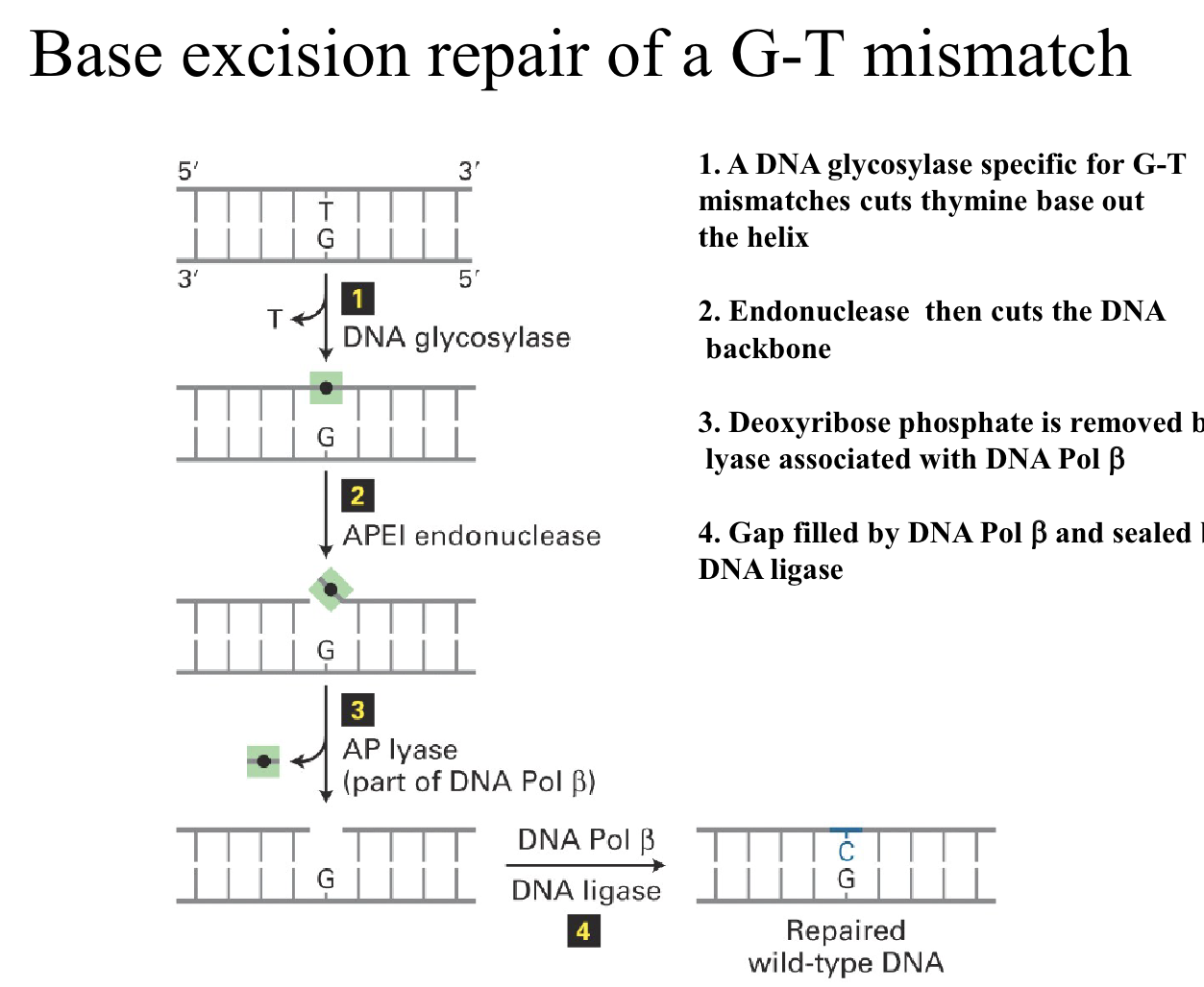 DNA gkycosylase recognises GT and removes the damaged base by cutting glycosylic bond. leaves an AP site