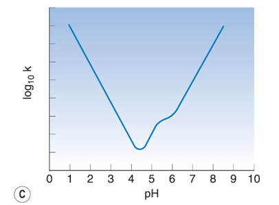 -at high and low pH, rate of hydrolysis is high, so degradation rate is high, so shelf-life is shorter. So, add buffering agent to make pH as close to 4.5 as possible