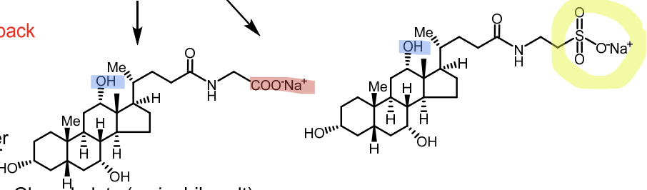 Conjugated with glycine or taurine (secondary) → glycocholic acid, taurocholic acid