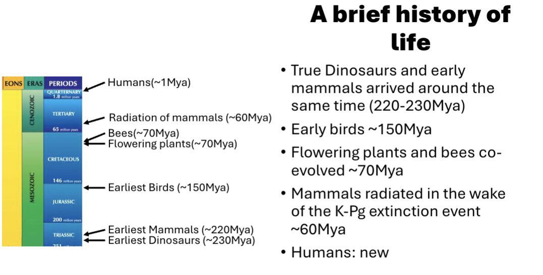 End of triassic killed all dinosaurs → K-Pg (cretaceous-paleogene) blossomed with radiation of mammals