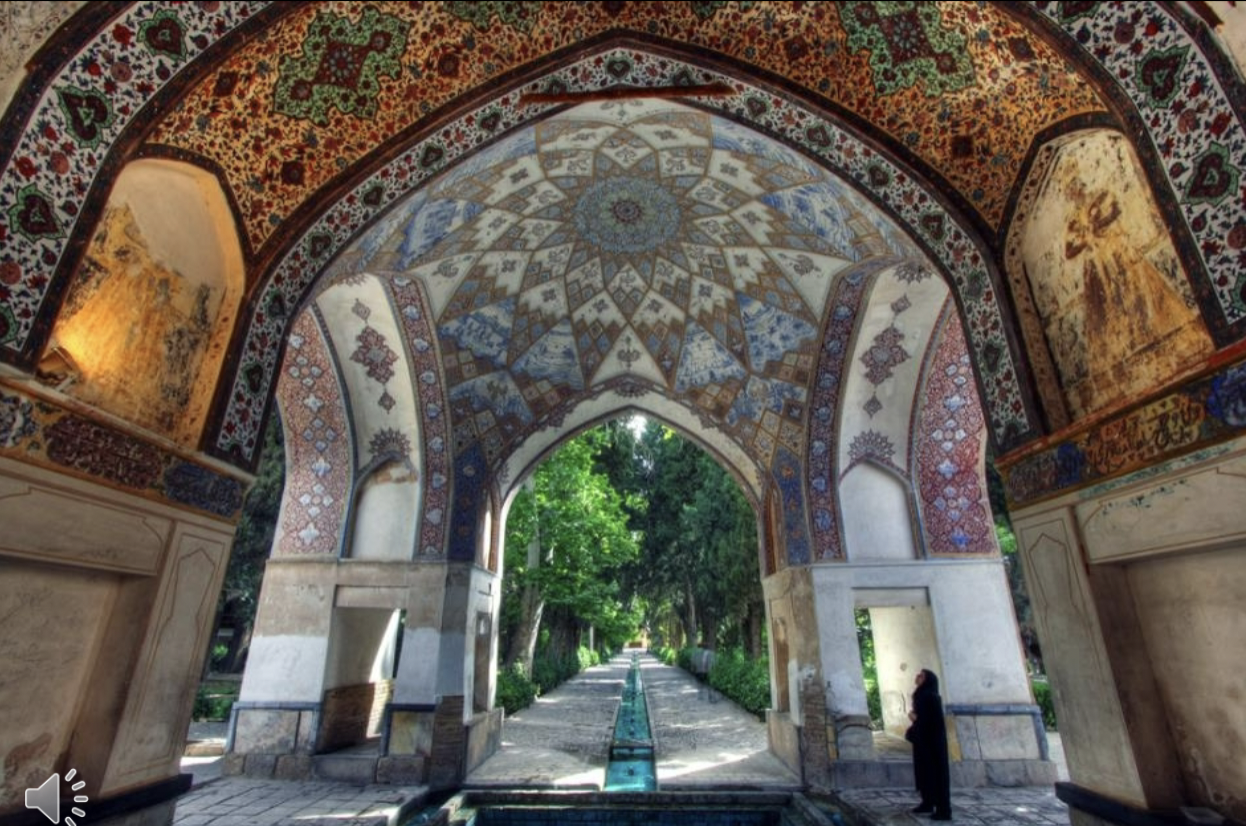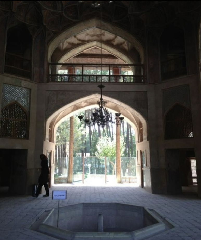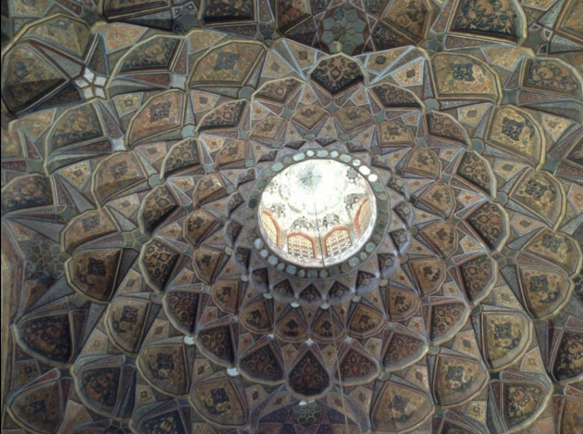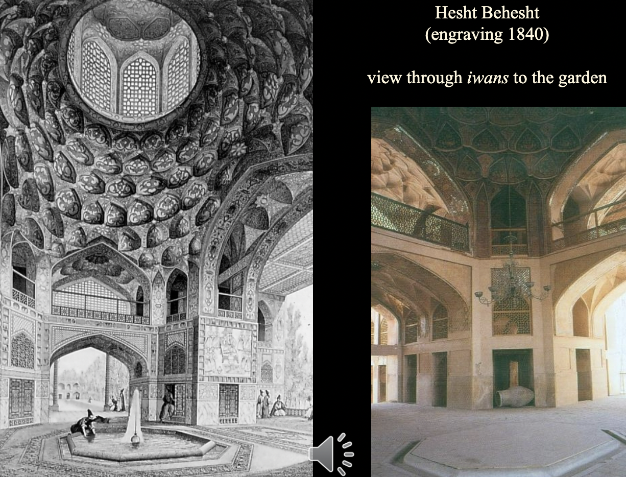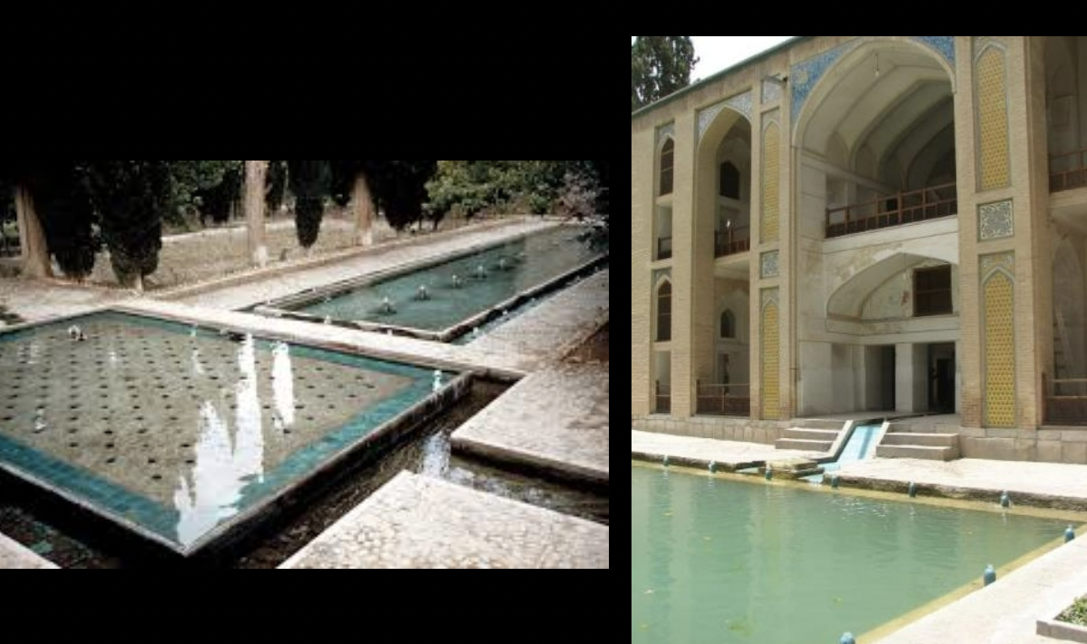 pavilion = center piece of garden, it has a grand fountain, under muqarnas dome painted with gold, tiny mirrors and occulus