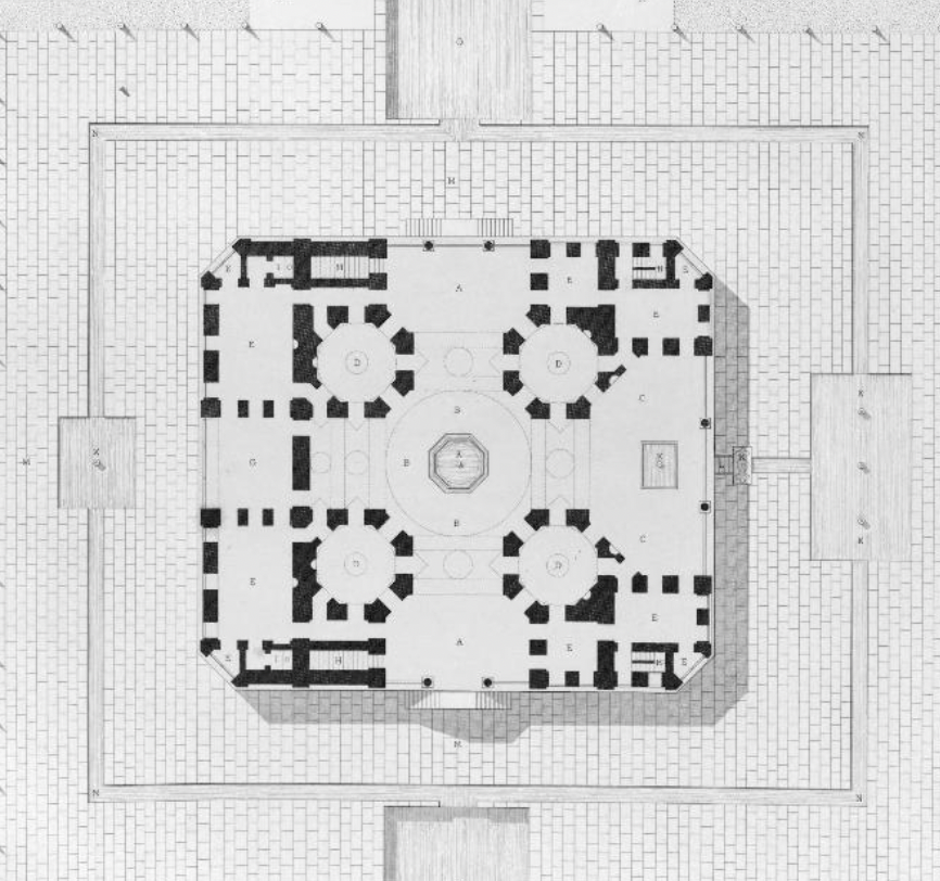 Tomb = double-shell central dome, 8-part hesht behesht plan (timurid influence)