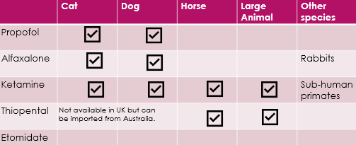 Dogs —> obesity, brachycephalics, temperament variable, can induce to effect, IV access easy