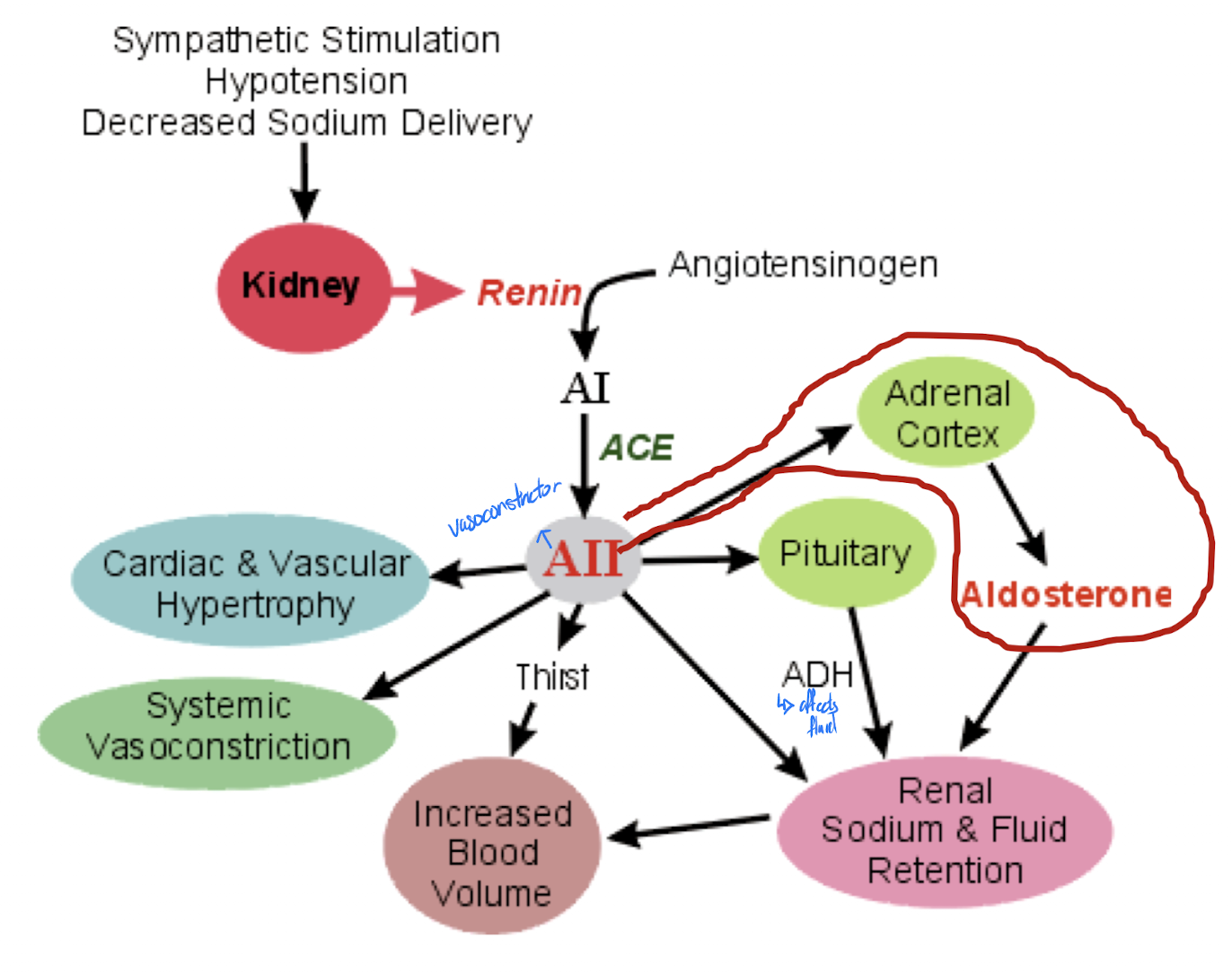 angiotensinogen (from liver) -(renin from kidney)→ angiotensin 1 -(ACE)→ angiotenin 2