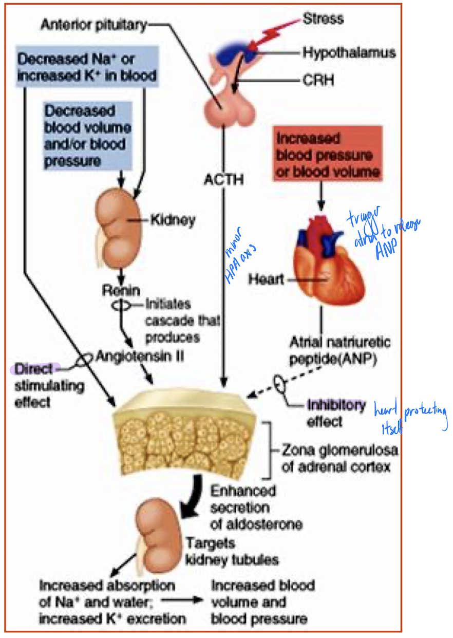 CRH (hypothalamus) → ACTH (anterior pituitary) → aldosterone (zona glomerulosa) usually ACTH (not specific to just aldosterone!!) a minor player - comes into effect if individual severely stressed