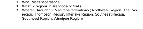 Seven regions throughout Manitoba representing Métis federations.
