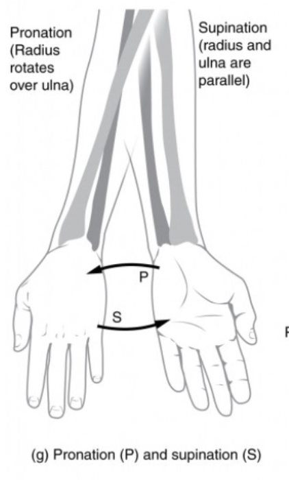 supination: motion restoration of forearm to palm facing anteriorly (anatomical position)