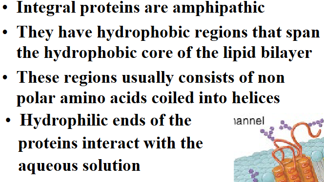 • Integral proteins: extend into or completely across cell membrane (transmembrane protein)