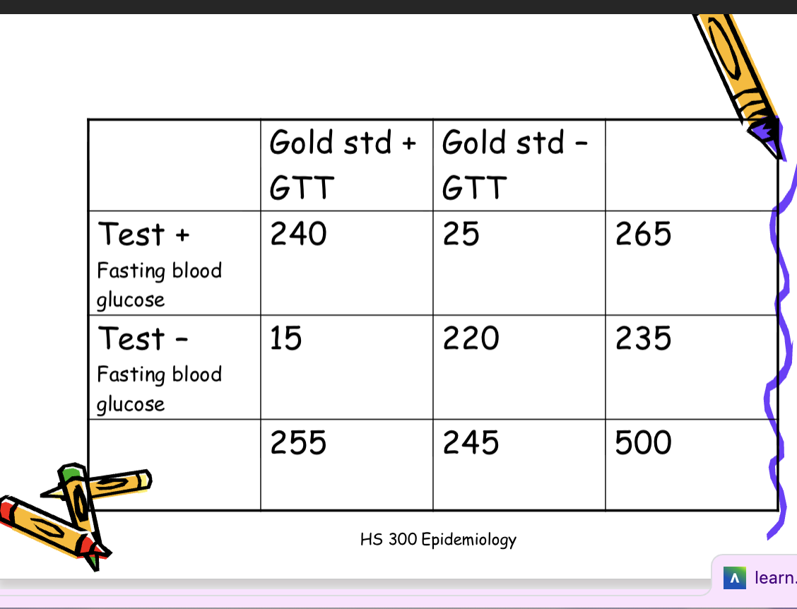 Calculate sensitivity (a/a+c): Among those tested, 94.1% of persons with diabetes screened positive by fasting blood