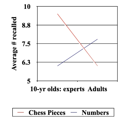 Ex) On a graph, the blue line represents a random memory task where adults outperform children, showing the advantage of general content knowledge. The red line represents a chess-specific memory task where child experts outperform adults, showing that domain expertise can lead to better memory within that specific area. This demonstrates that the type of knowledge tested affects performance.