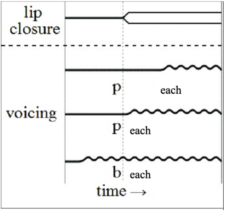 The difference in timing between when the lips release a sound and when the vocal cords start vibrating. For example, “buh” and “puh” are similar sounds but differ in when voicing begins.