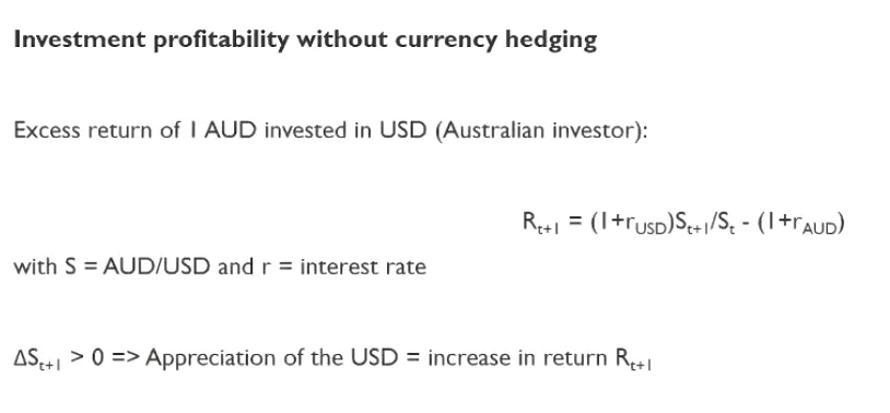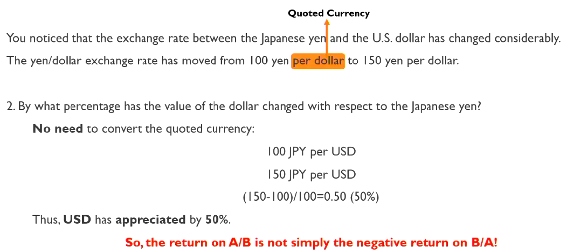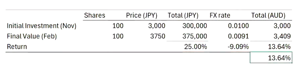 The total return in domestic currency (AUD) reflects both the asset's price return in foreign currency (JPY) and the FX rate change — multiply the foreign currency total by the FX rate (AUD/JPY) to convert to AUD, then calculate the return as (Final AUD Value − Initial AUD Value) / Initial AUD Value