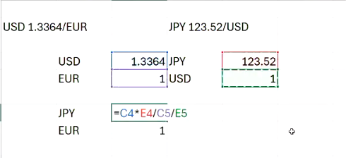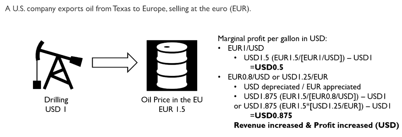 Divide when the rate is expressed as foreign currency per unit of domestic currency (EUR/USD); multiply when the rate is expressed as domestic currency per unit of foreign currency (USD/EUR) — both convert foreign currency revenue into domestic currency terms