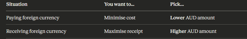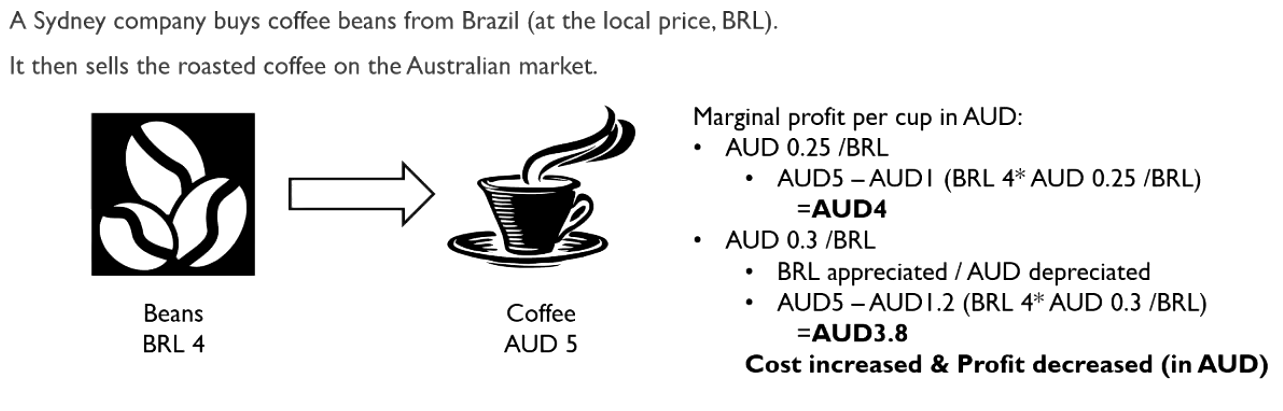 Multiply when the rate is expressed as domestic currency per unit of foreign currency (AUD/BRL) — this converts foreign currency costs into domestic currency terms, where a stronger foreign currency means higher costs and lower profit.