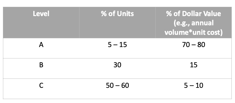 An inventory classification system in which a small percentage of items (A-level) account for most of the inventory value