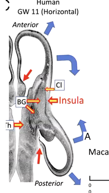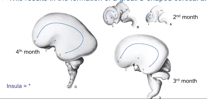 originally caudal regions get pushed ard by skull to lie inferior to insula — forming temporal lobe