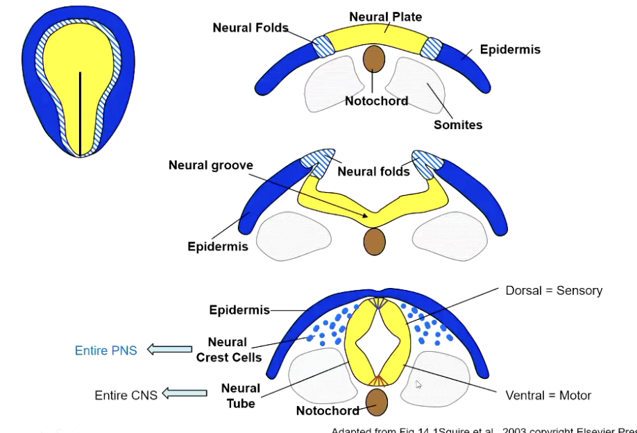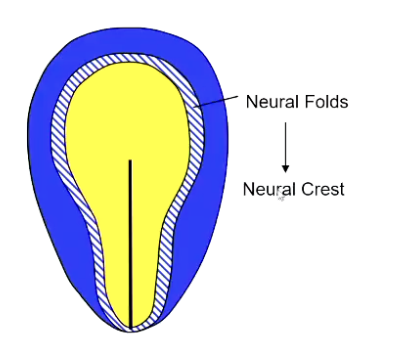 (2→3) next stage — neural folds reach midline — migrate inside and form neural crest cells — forms whole of the PNS