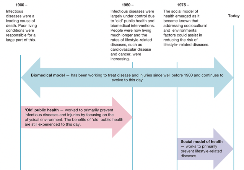 Once infectious diseases were controlled (thanks to old public health and the biomedical model), focus shifted to the lifestyle diseases and their contribution to mortality and morbidity (around 1970s)