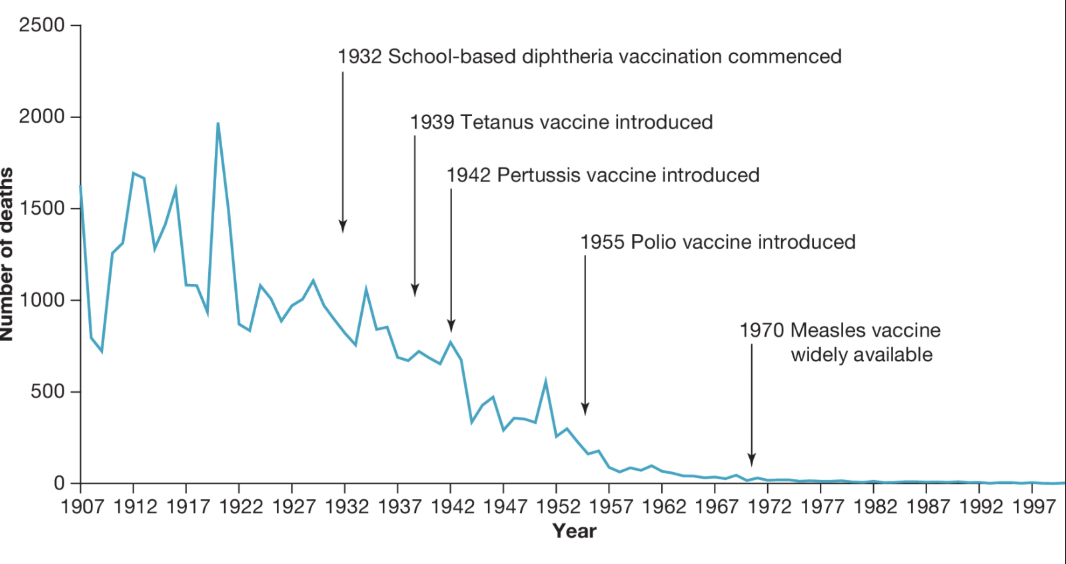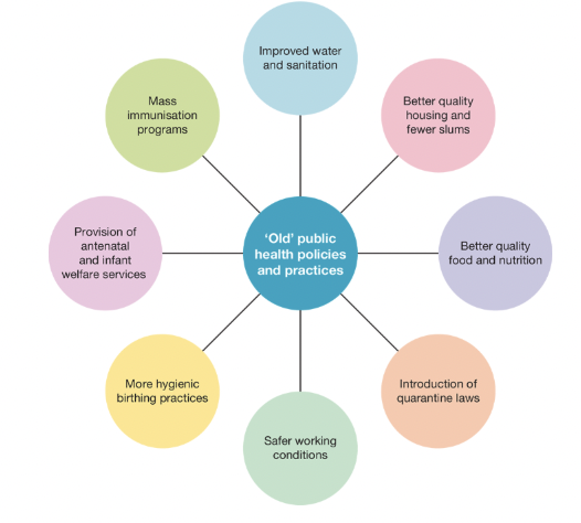 Important to note that the discovery of vaccines themselves is not an 'old' public health initiative (it's biomedical), rather ensuring that as many people as possible received these vaccines through mass public vaccinations in schools/community settings is the 'old' public health initiative.