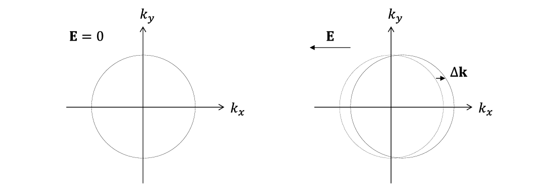 In an E field, electrons are accelerated, and the Fermi surface shifts by Δk in the direction opposite to the field.
