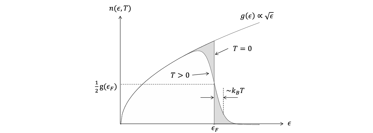 The number of electrons per unit energy at a given temperature (i.e., at thermal equilibrium) is N(ϵ,T)=g(ϵ)f(ϵ,T).