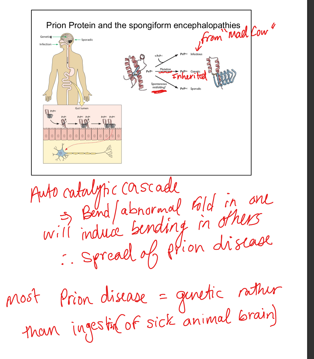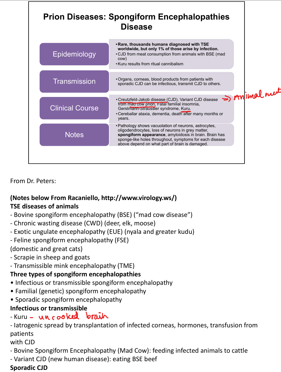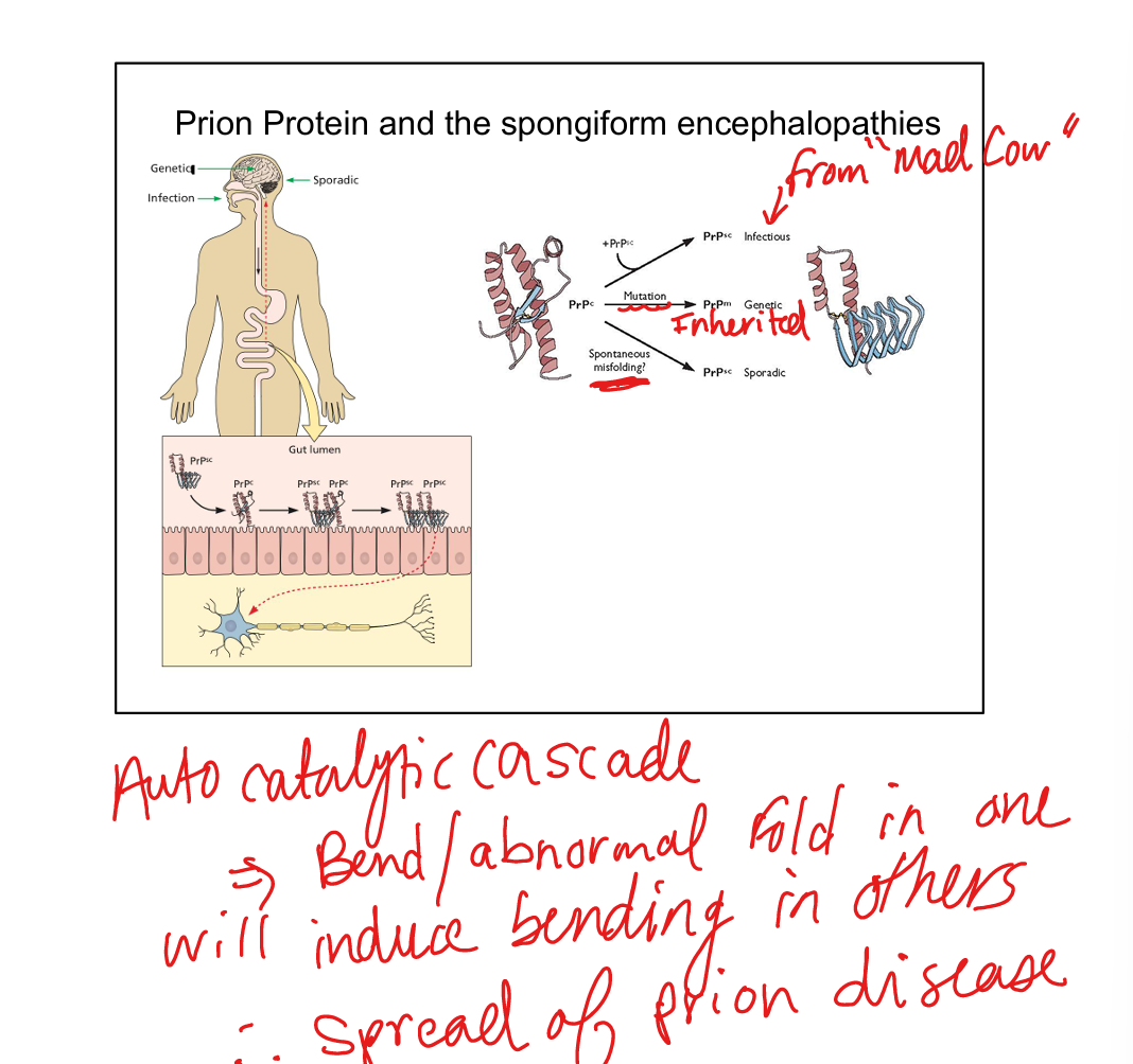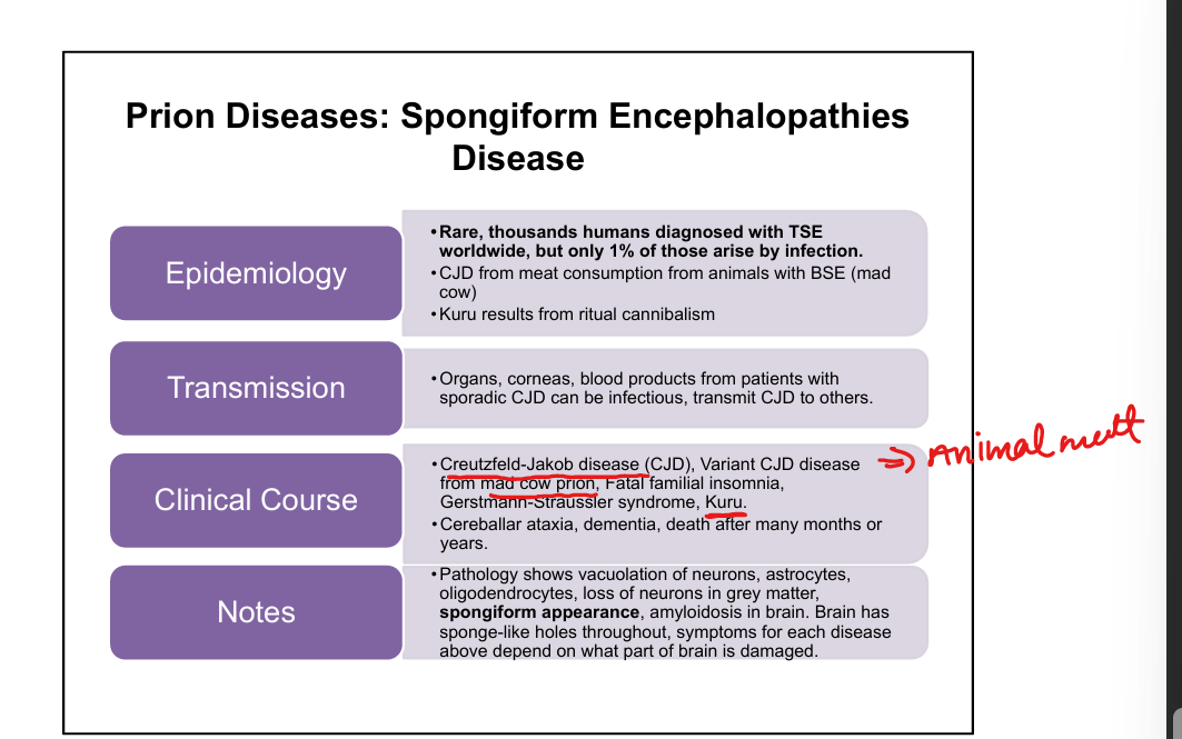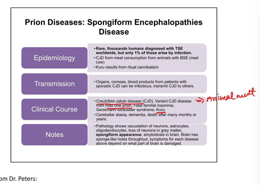 CJD-Creutzfield-Jakob Disease, variant CJD from Mad Cow Disease, Kuru(eating brain of person with CJD), Fatal Familial Insomnia, Gerstmann‑Sträussler‑Scheinker syndrome.