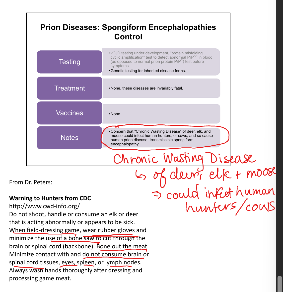 Avoid sick animals; wear gloves; avoid brain/spinal tissue; bone out meat; wash hands thoroughly.