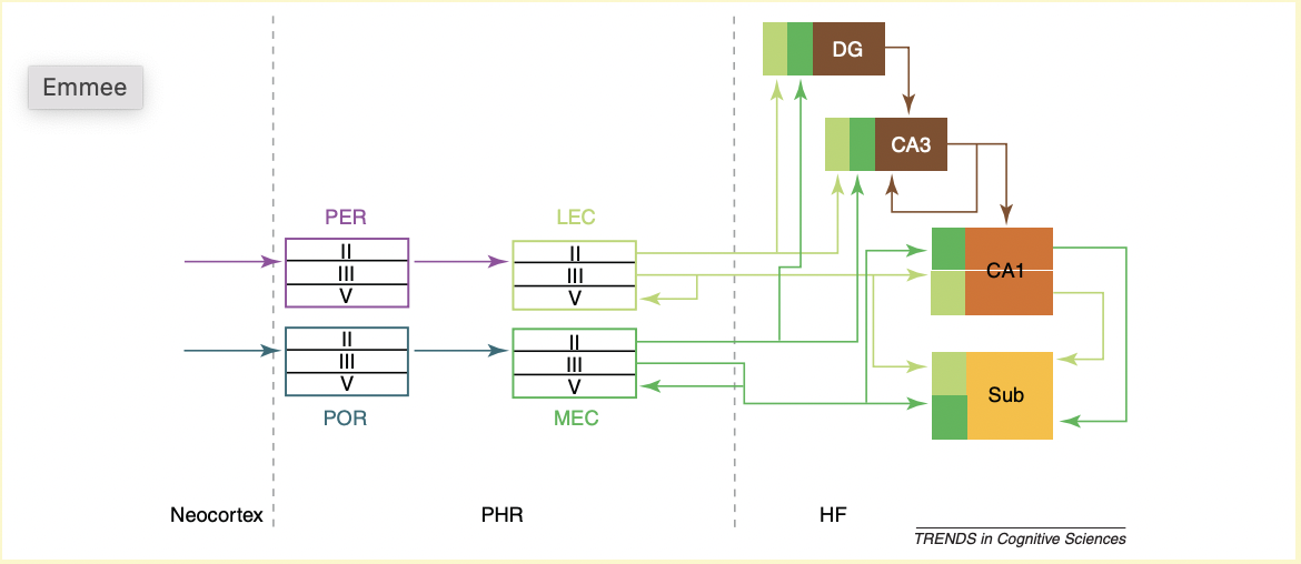 The broader region surrounding this system is called the parahippocampal region. This region includes the perirhinal cortex, the postrhinal cortex, and the entorhinal cortex, which itself is divided into medial (MEC) and lateral (LEC) parts.