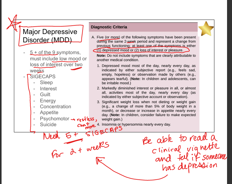 ≥5 symptoms for ≥2 weeks, including depressed mood or anhedonia(low interest), causing functional impairment. SIGECAPS