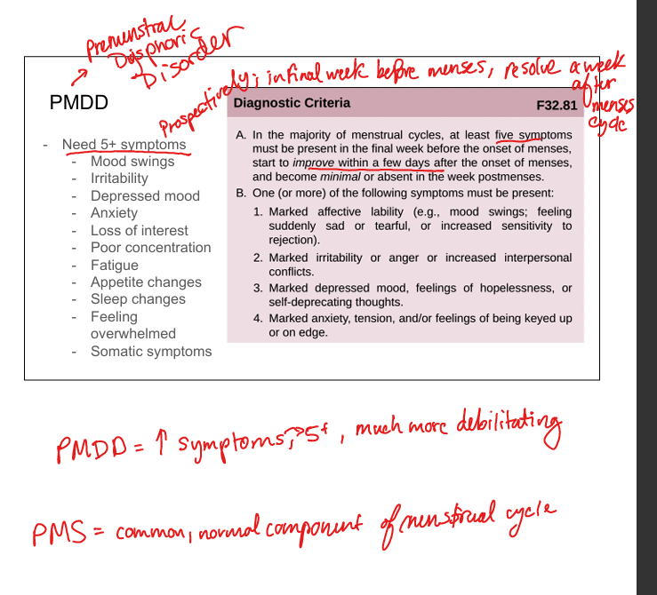 Mood lability, irritability, depressed mood, anxiety + somatic/behavioral symptoms 5+ symptoms present in final week before onset of menses; go away/minimal after menses