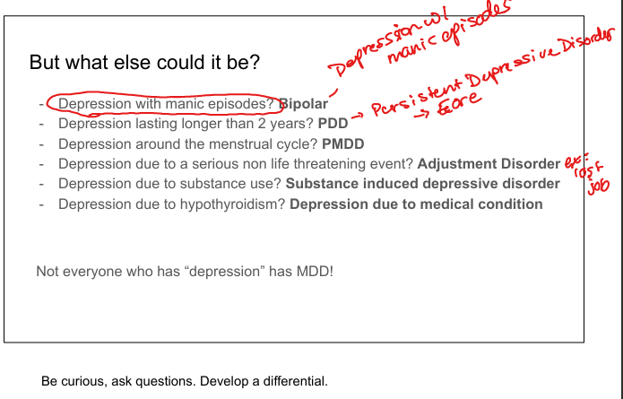 Bipolar disorder, Persistent Depressive Disorder (PDD), PMDD, adjustment disorder, substance‑induced depression, depression due to medical condition.