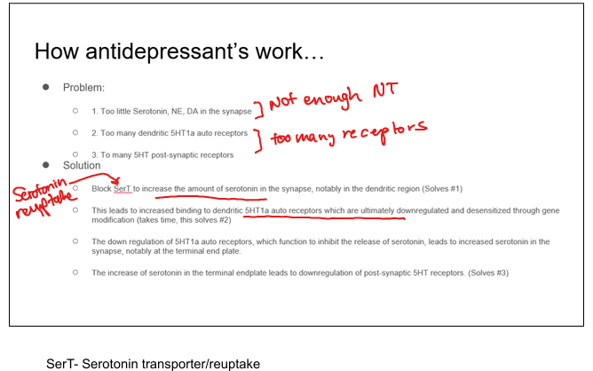 Block SERT → ↑ serotonin → downregulate autoreceptors → ↑ neuronal firing → ↑ synaptic serotonin.