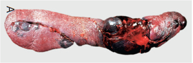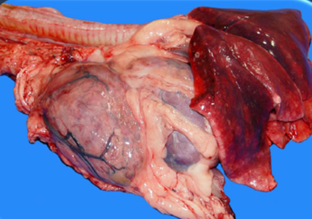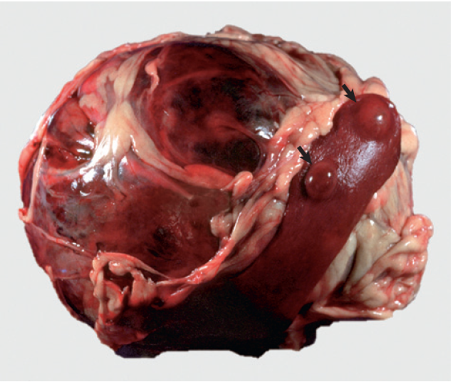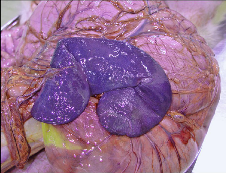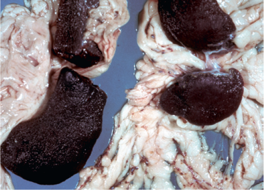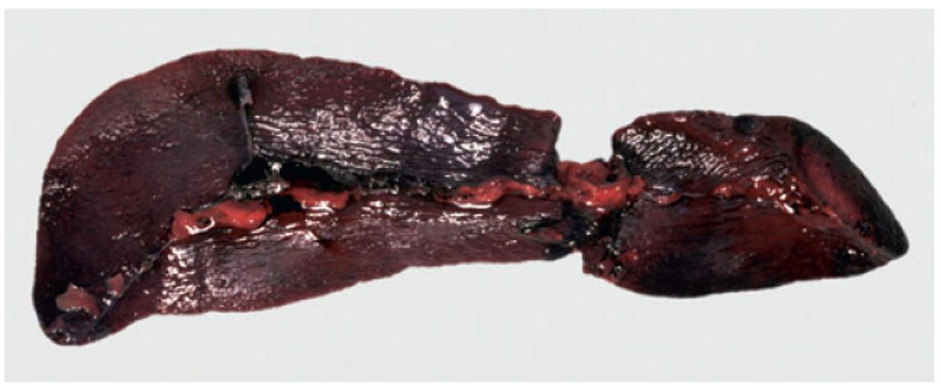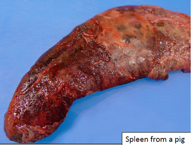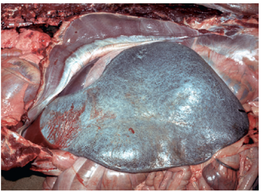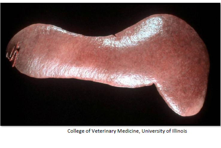 Splenic congestion from barbiturate euthanasia —> spleen very enlarged and congested from storage of blood