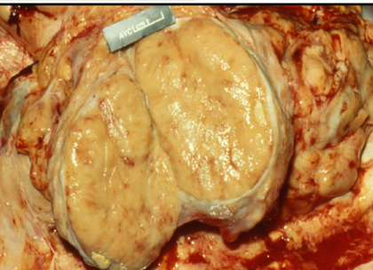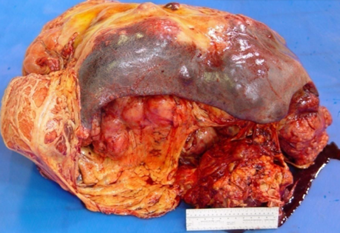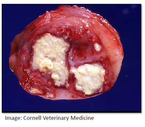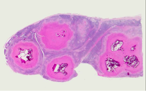 Histo —> contains golden brown pigment (haemosiderin), blue-purple mineralisation
