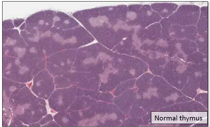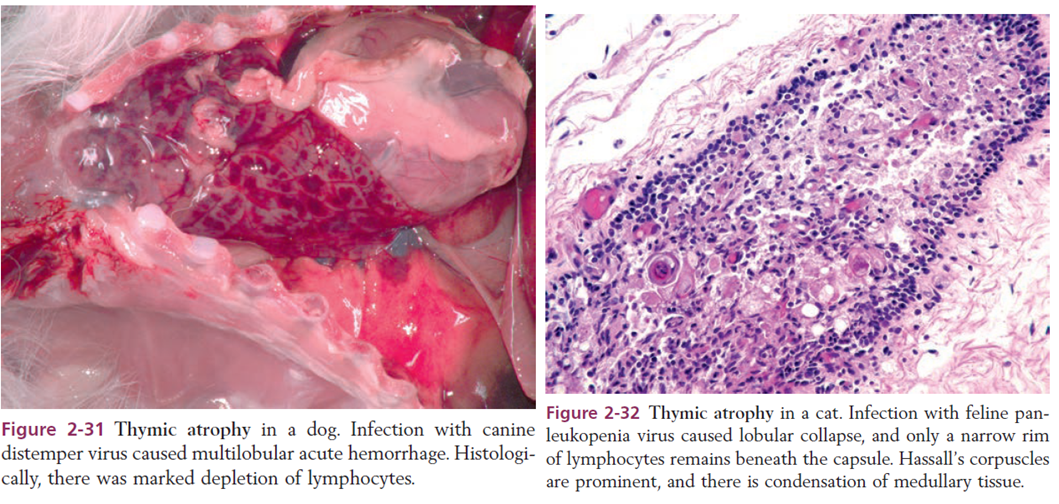 Shrinkage of thymic organ by inadequate nutrition, intoxications, infectious agents (e.g. canine distemper virus), lack of antigenic stimuli, drugs etc.