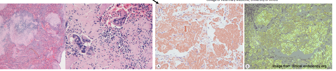 Usually secondary amyloidosis, chronic inflammation (acute phase protein SAA)