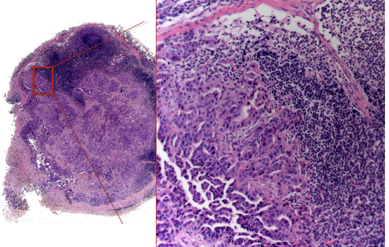 Gross —> lymphoid follicles visible as 1-3 mm foci