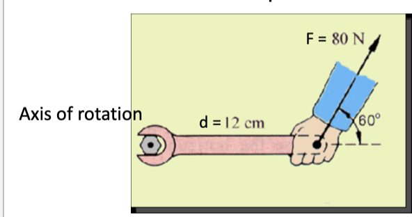 An 80N force acts at the end of a 12cm wrench as shown. What is the torque ?