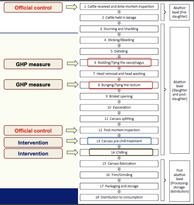 Interventions: in most abattoirs- most common knife trimming and steam vacuuming