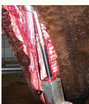 • Thoracic (chest) cut: preferable, severing brachiocephalic trunk (in all abattoirs where animal is hoisted)