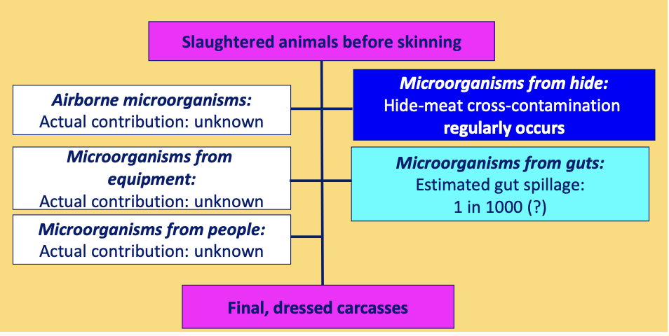 What are the main sources/routes of microbial contamination during slaughter and dressing?