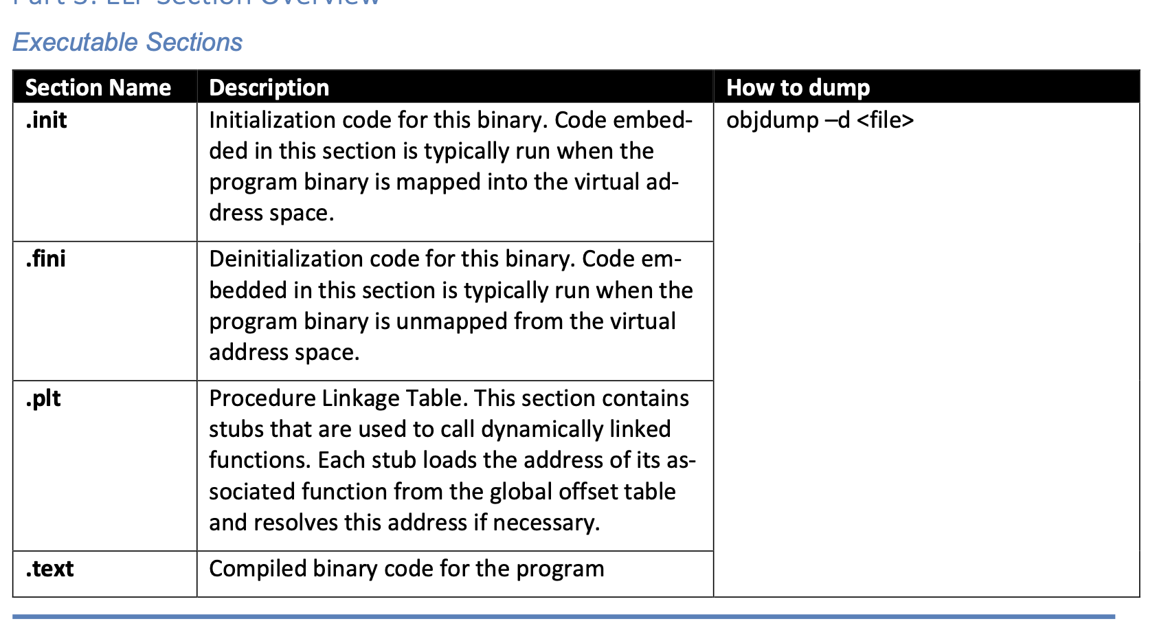 to summarise the roles and types of content of the different types of code and data sections;