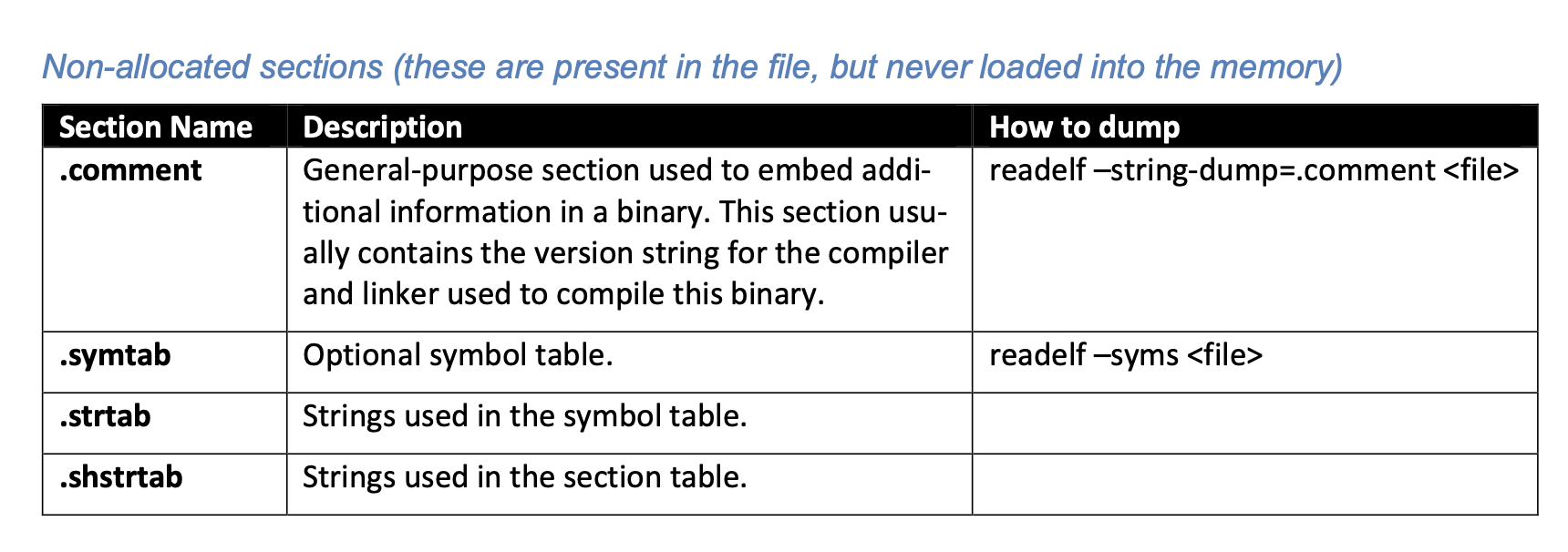 Full .symtab, .strtab, debug sections are optional in final binaries.
