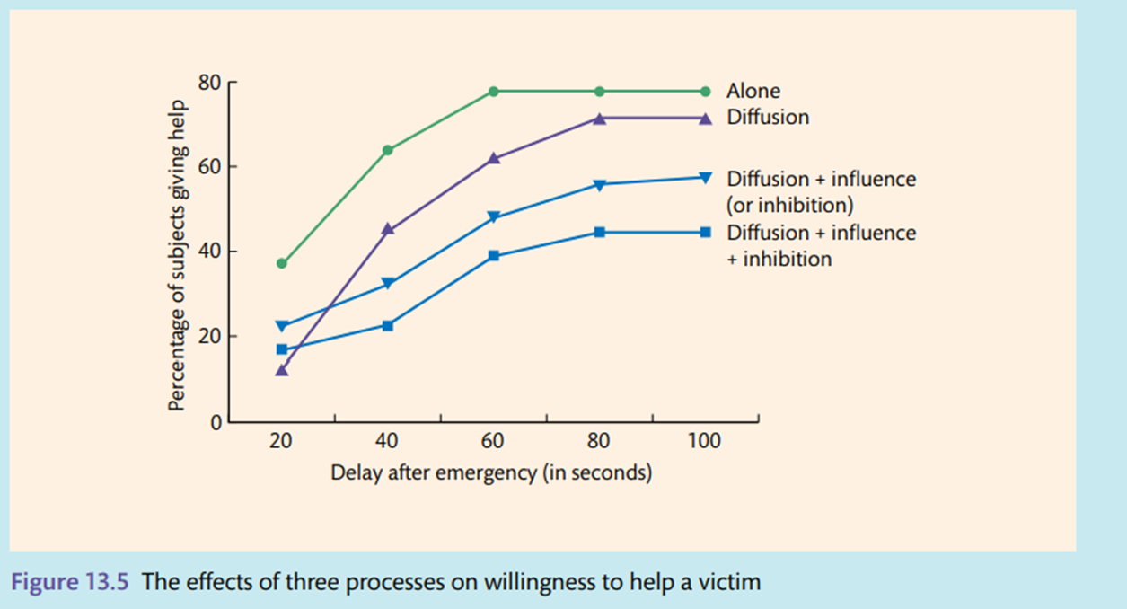 -diffusion of responsibility, social influence and audience inhibition all reduced percentage of people helping
