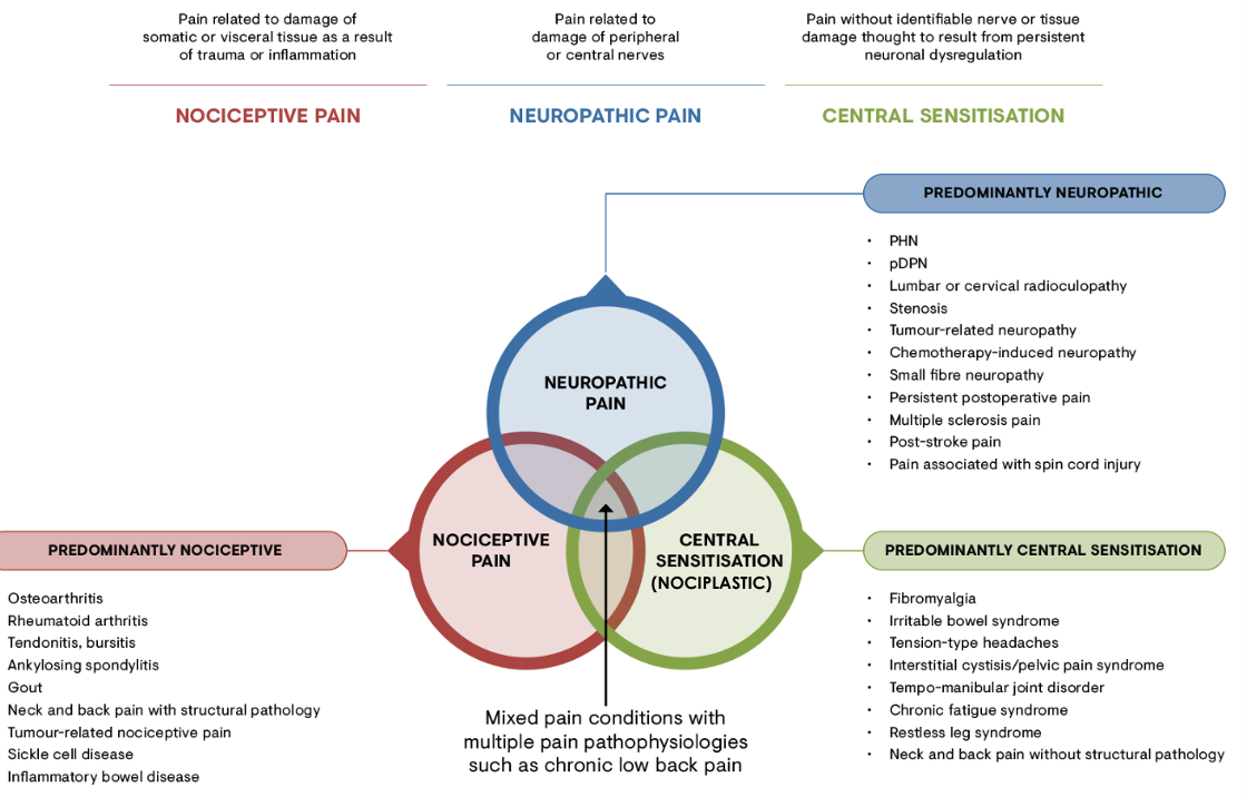 Central Sensitization: can be Nociplastic or Mixed, some Neuropathic