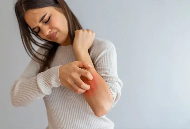 an uncomfortable feeling on the skin that makes you want to scratch.