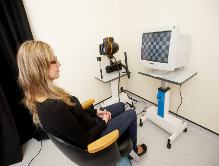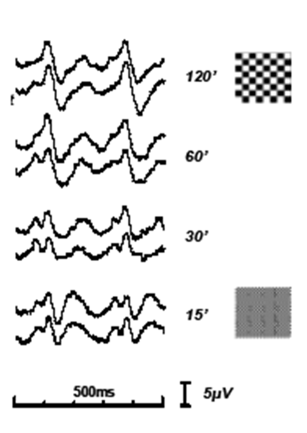 •Stimuli - Pattern / Flash / checkerboard (which can be changed in size - helps us determine objective VA)